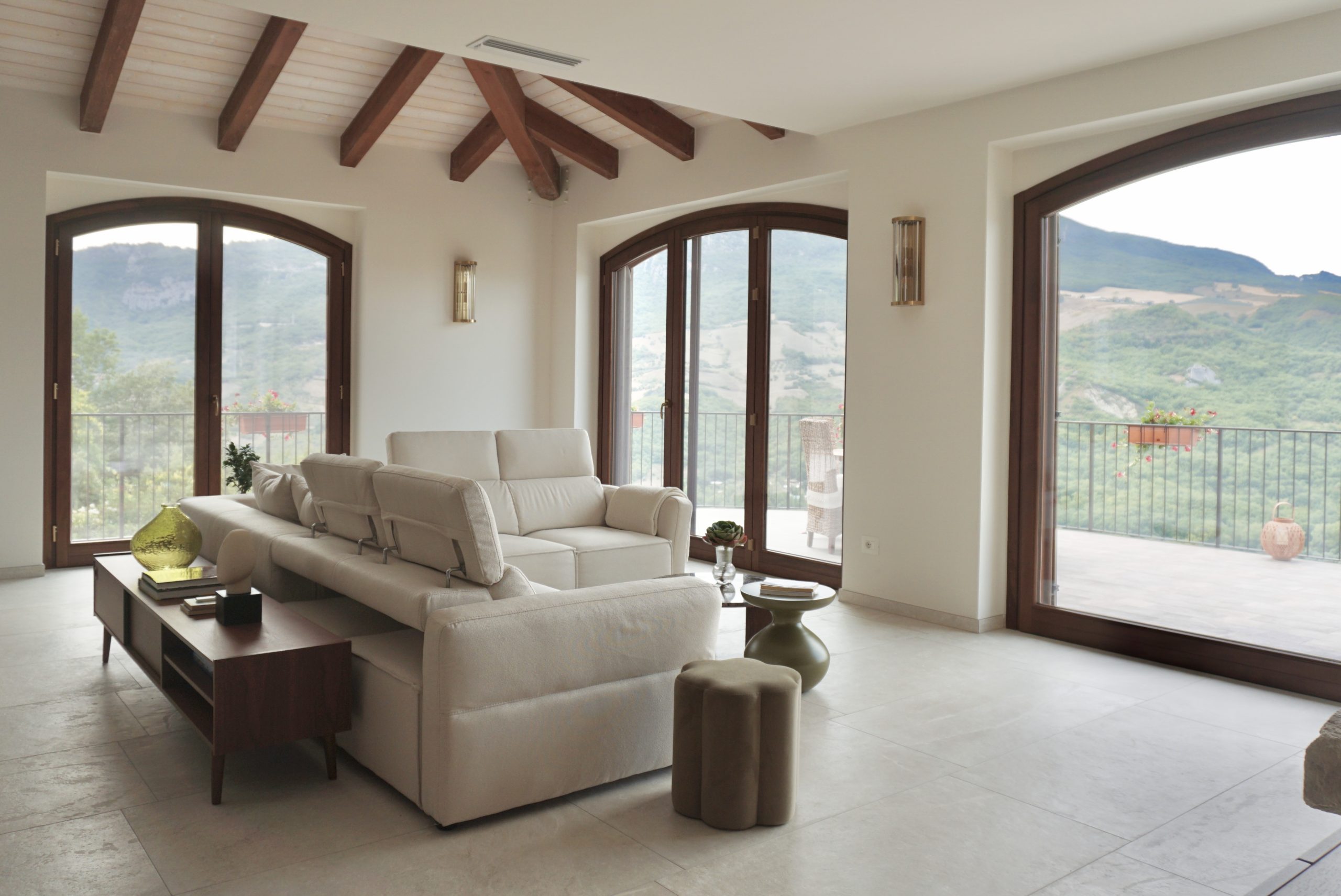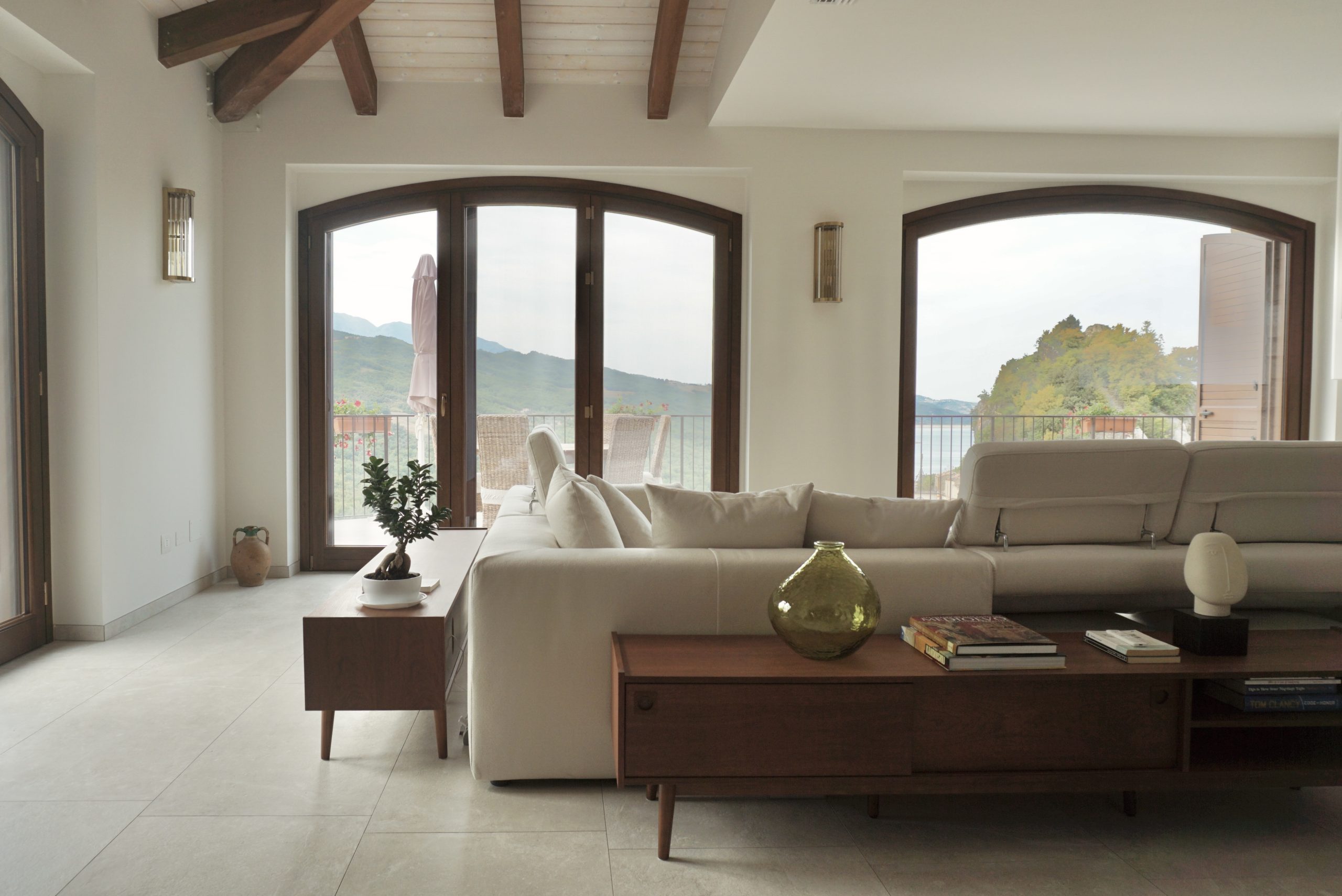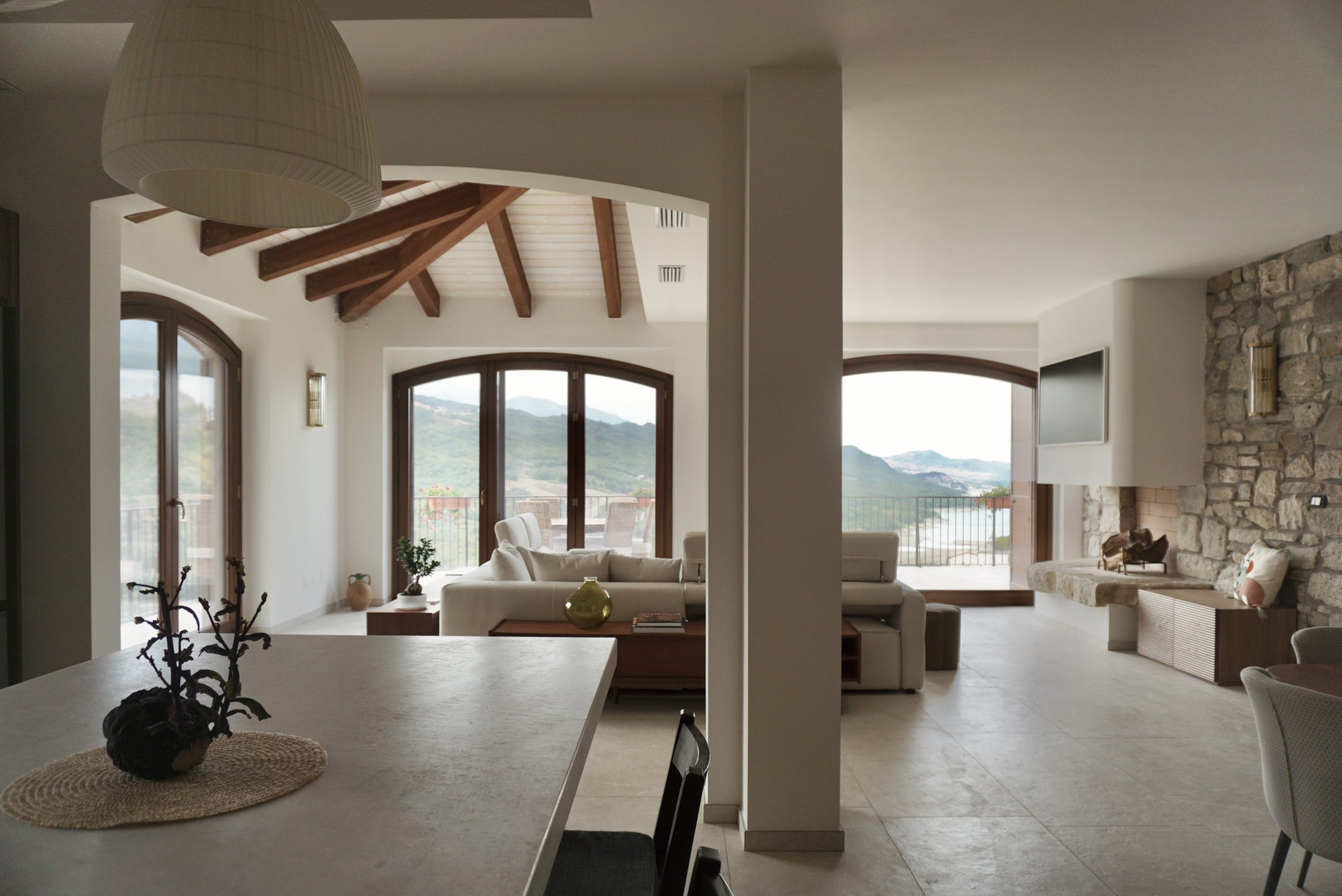 Una villa immersa nel verde, a picco sul Lago di Bomba. Ogni spazio dialoga con il paesaggio, ma il vero fulcro della casa è la zona giorno, concepita come una sorta di piazza domestica in cui prende vita l’esistenza quotidiana. Una stanza che si apre come un anfiteatro verso l’esterno: il punto focale sono le due grandi vetrate ad arco, quinte sceniche che incorniciano la “Pietra” – roccia simbolo del paese – e il lago sottostante.