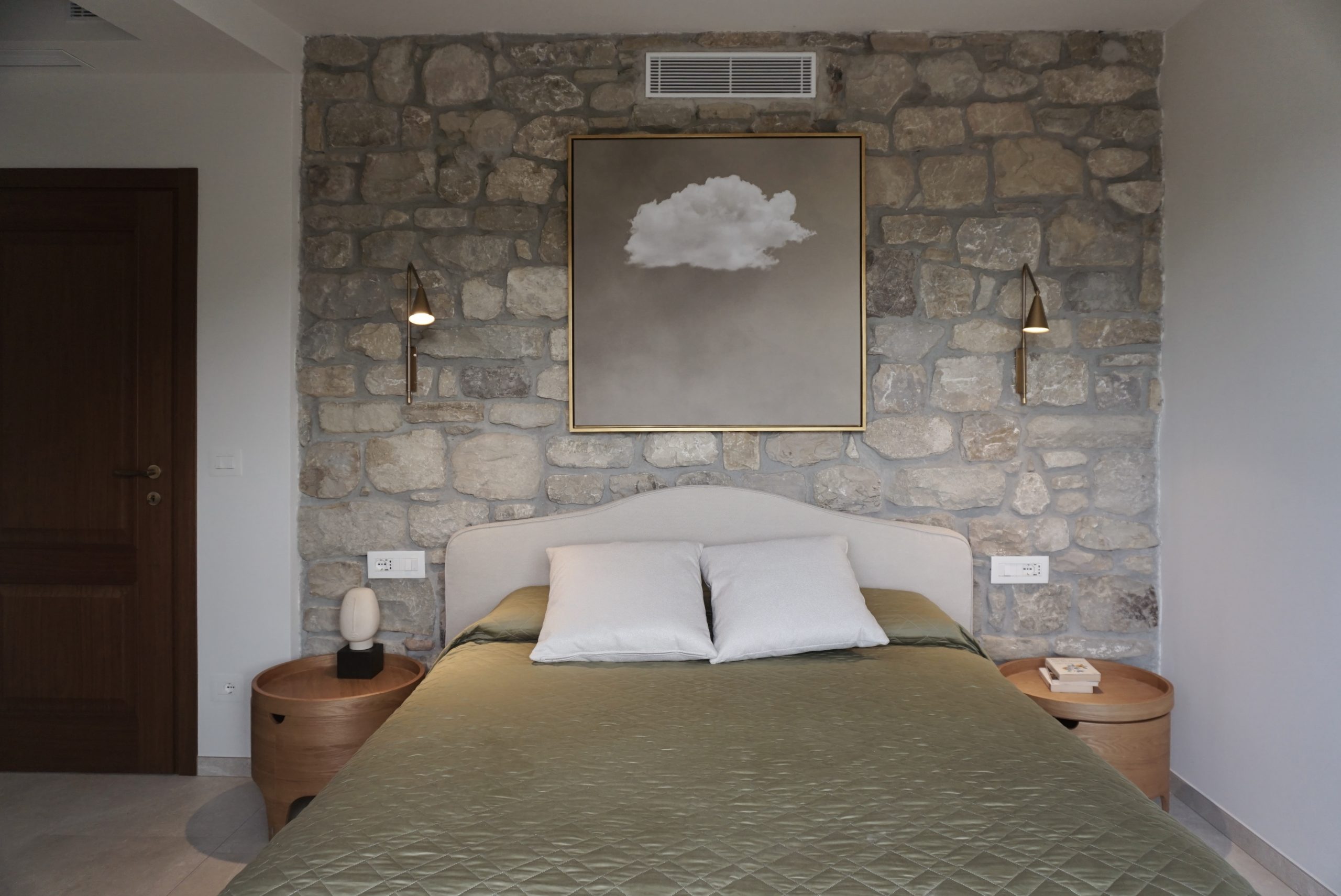 Molti elementi sono stati progettati ad hoc: la parete in pietra che caratterizza il living e la camera da letto è composta da grandi lastre, applicate una ad una dagli artigiani locali come un mosaico che restituisce alla superficie la forza e la ruvidità della roccia. Il caminetto nasce da un unico grande blocco di pietra leccese, scelto direttamente in cava. L’isola della cucina, che richiama i tavolacci da lavoro di una volta, è stata costruita da un falegname e sormontata da un monolite di marmo bianco.