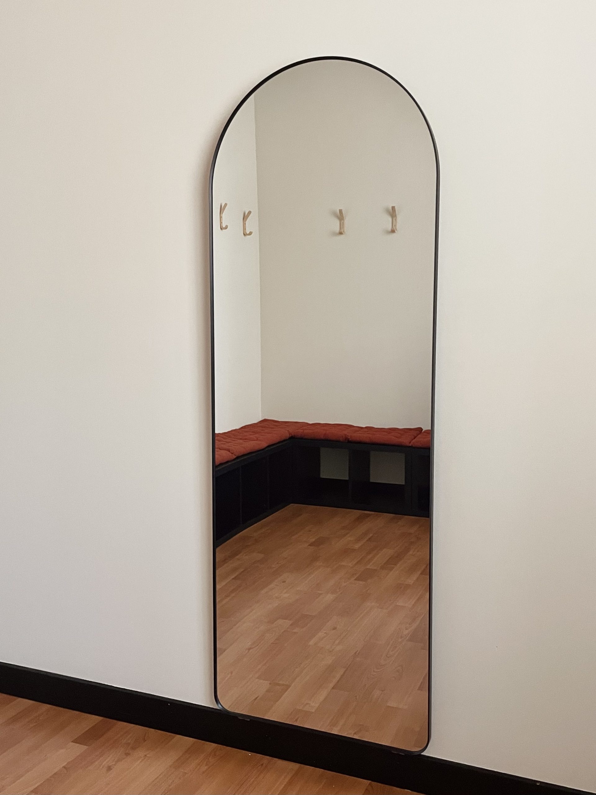 Gli specchi ad arco sono un omaggio alla cliente, che nasce come insegnante di danza. Cosi in questo nuovo spazio, abbiamo voluto custodire un frammento della sua storia con questi specchi che ricordano le scuole di danza parigine degli anni ’30.